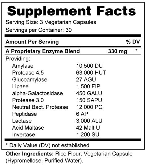 Ingredients: Amylase, Protease, Glucoamylase, Lipase, Alpha Galactosidase, Peptidase, Lactase, Maltase, Invertase (Sucrase)